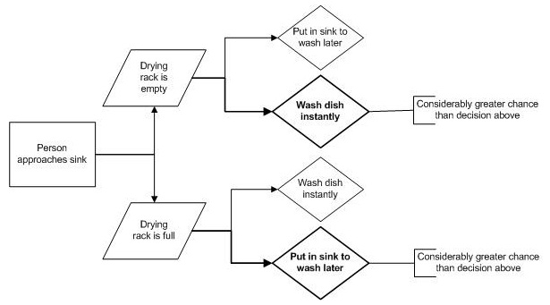 Summary: People approaching the sink, will have two choices: Wash the dishes instantly, or put in sink to wash later. If the drying rack is full, the chance that they will wash the dishes instantly decreases dramatically. In other words: if the drying rack is empty (or has considerable space), a person will be more likely to wash their dirty dish. This is of course in a general case. There are variations depending on the size, the dirtiness of the dish to be washed, and also if the sponge is readily available, if there is enough dish-washing liquid. Consider the decision chart below:
