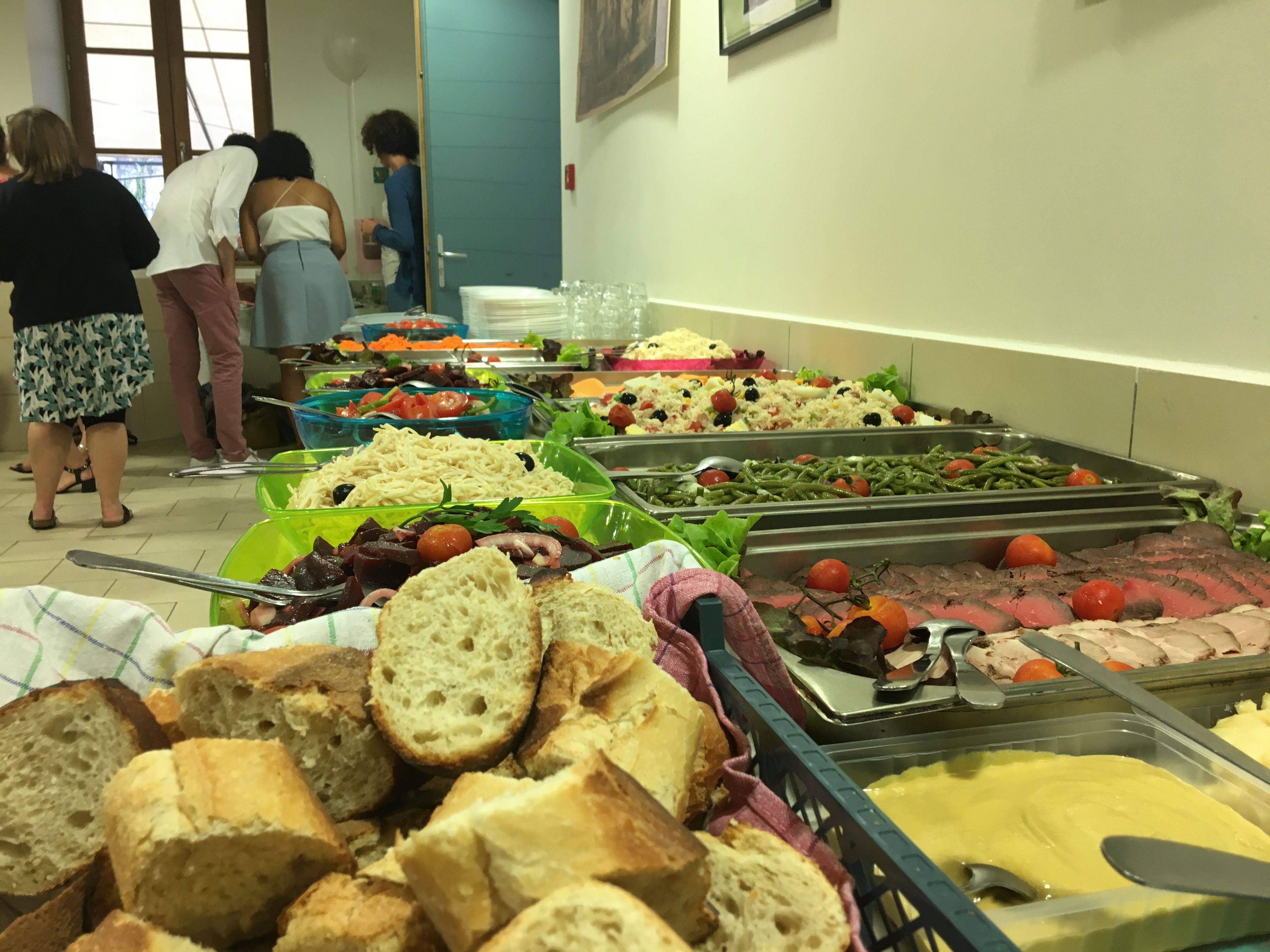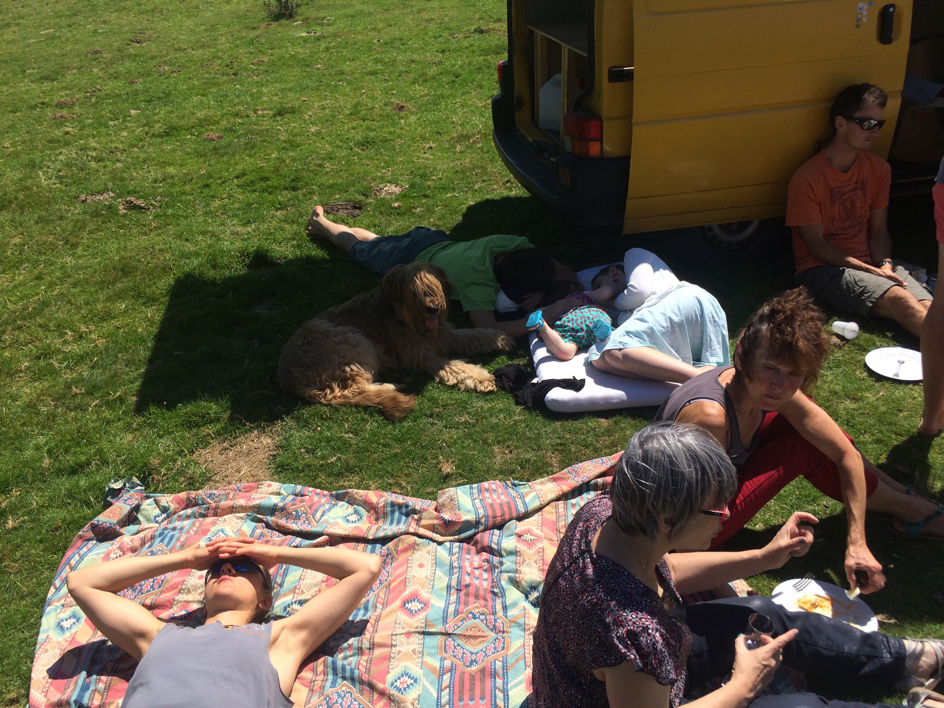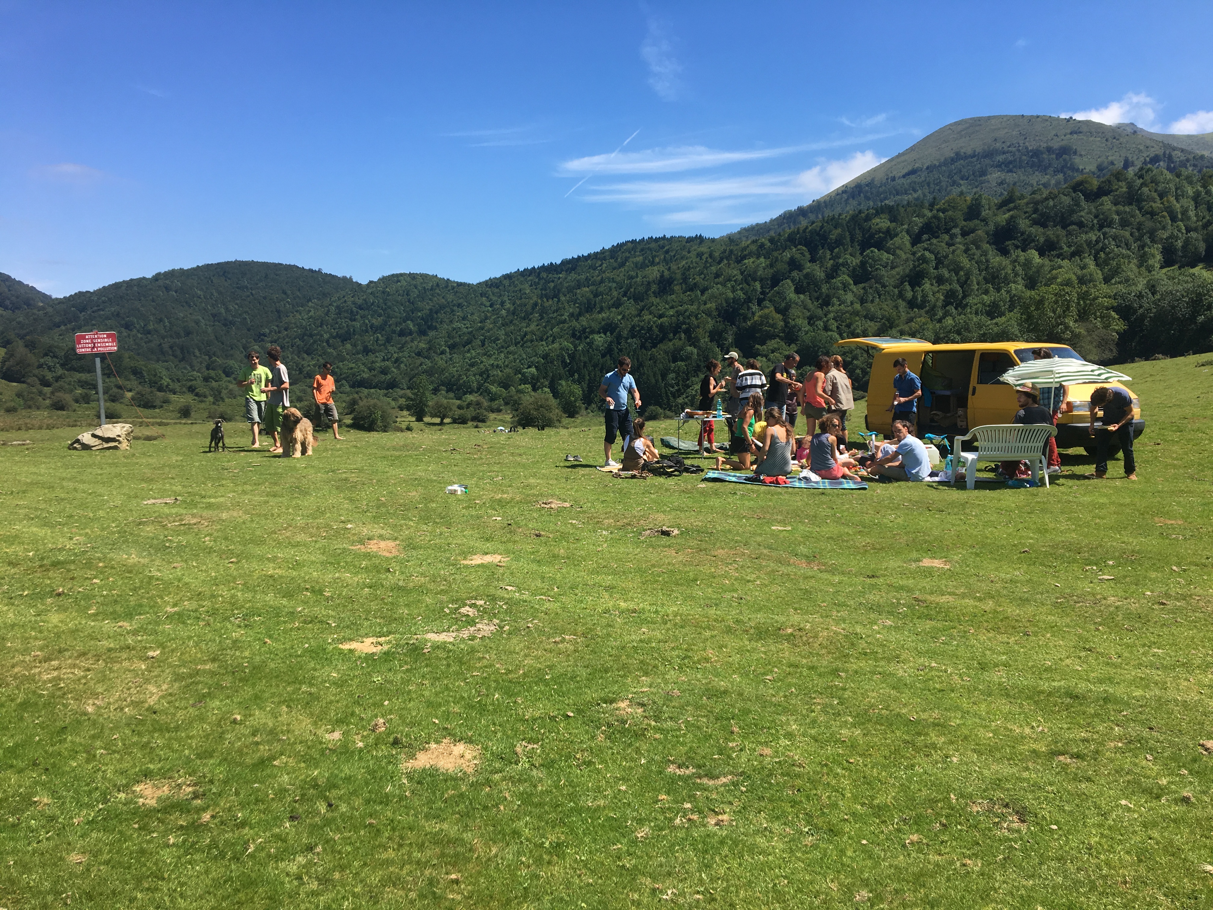 At the top, we were treated by a loud eew-haw from the next door donkey and grazing horses with cowbells chiming across the field of soft green grass – the type you would want to roll around in – except for the minefield of fresh and sun-dried cow pies. Paul had driven his yellow camping van to the middle of this open pasture, and dished out the boeuf-roti, ham, fromage de brebis, carottes-rapés, haricots vests, among many other delicacies of the region.